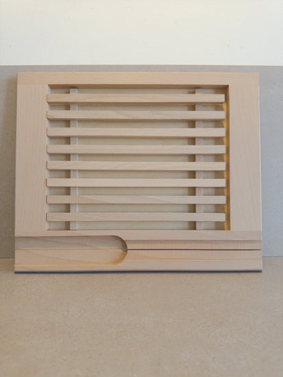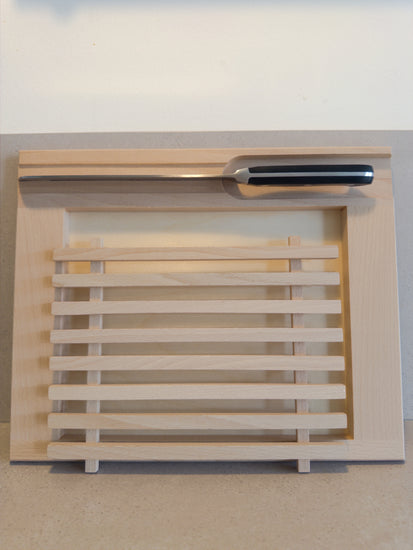 This high-quality bread cutting board impresses with its functionality and timeless design. Crafted from robust beechwood, the finely crafted grid ensures clean cutting: Crumbs fall through the slots into the compartment below and can be disposed of in a flash – keeping your kitchen surface always clean.